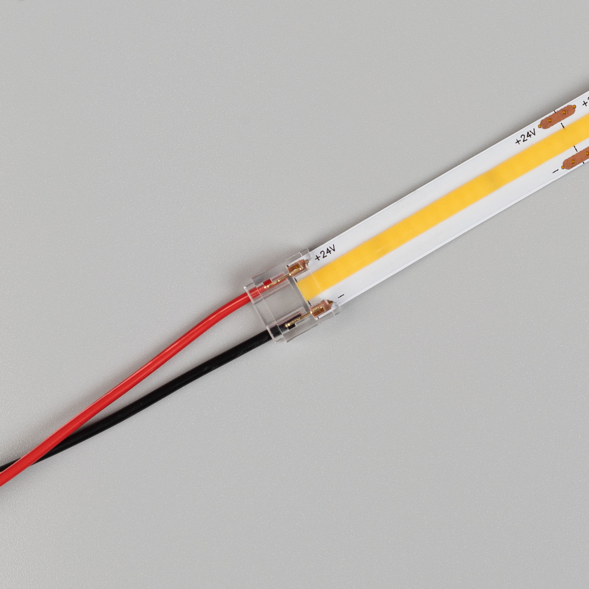 Одиночный коннектор для соединения 2-х отрезков открытых светодиодных одноцветных лент COB шириной 10 мм. Материал - прозрачный пластик. Обеспечивает соединение без видимых разрывов. Максимальный допустимый ток 3 А, максимальное напряжение 24 В, степень защиты IP20. Цена за 1шт, 10шт/пакет.