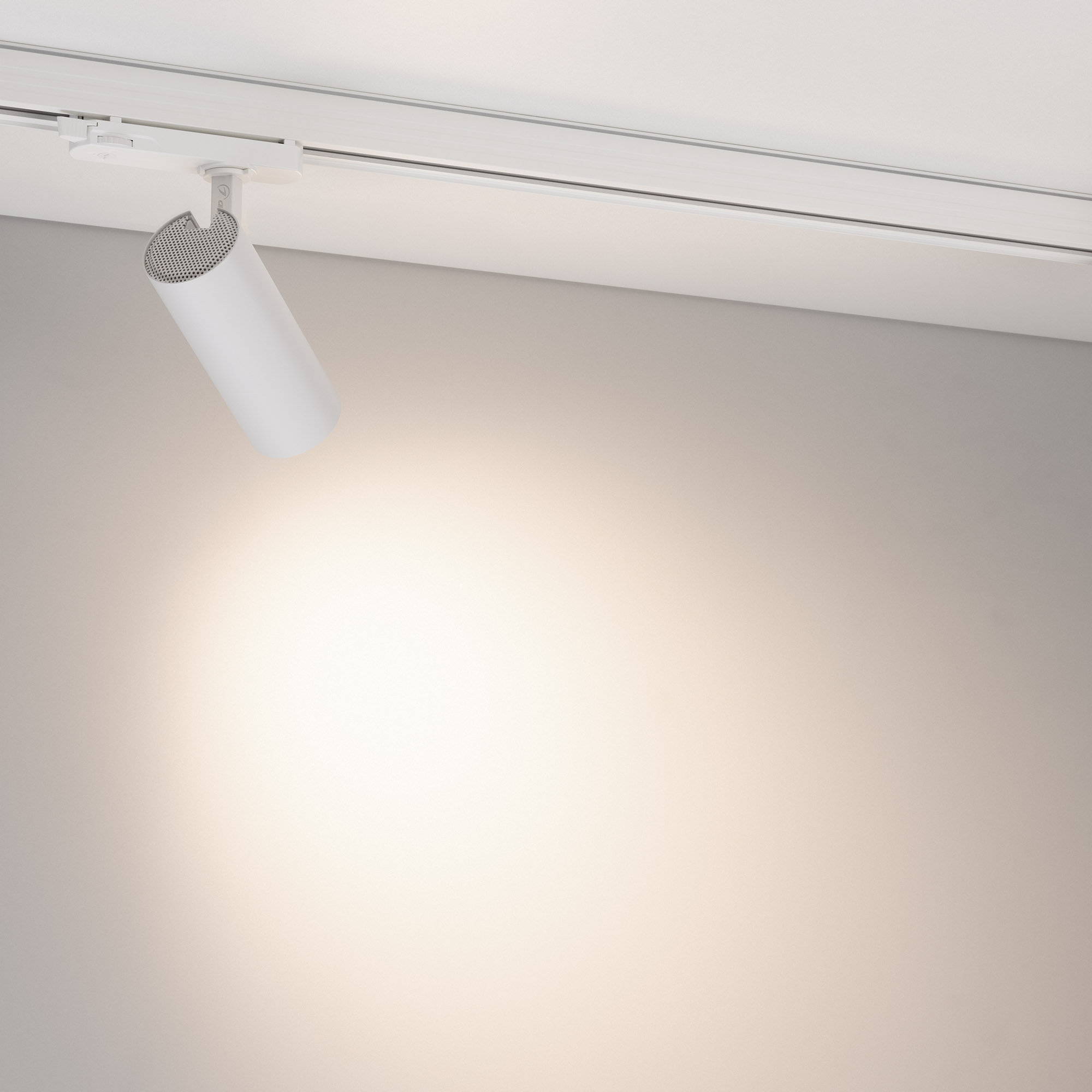 Светильник подвесной для треков/шин 4 провода. Мощность 10 Вт, св. поток без решетки honeycomb 1000 лм, 100 лм/Вт, с решеткой honeycomb 660 лм, 66 лм/Вт, дневной 4000 K, CRI>90, угол 55°, напряжение питания 230 В. Белый круглый корпус из алюминия, материал линзы PMMA, степень защиты IP20. Размер: диаметр 55 мм, длина световой части 141 мм. Монтаж на трек 3-фазный. Драйвер встроенный 24-42 В, 250мА., пульсация <5%.