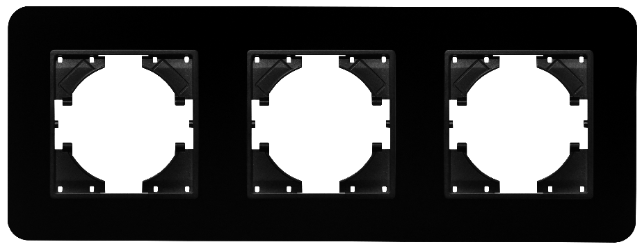 Рамка стеклянная на 3 поста, под встраиваемый механизм. Цвет - черный с Soft-Touch покрытием. Среднего уровня герметичности IP20. Ориентация монтажа  - горизонтальная (основным ориентиром служат посадочные выступы для накладки механизма).