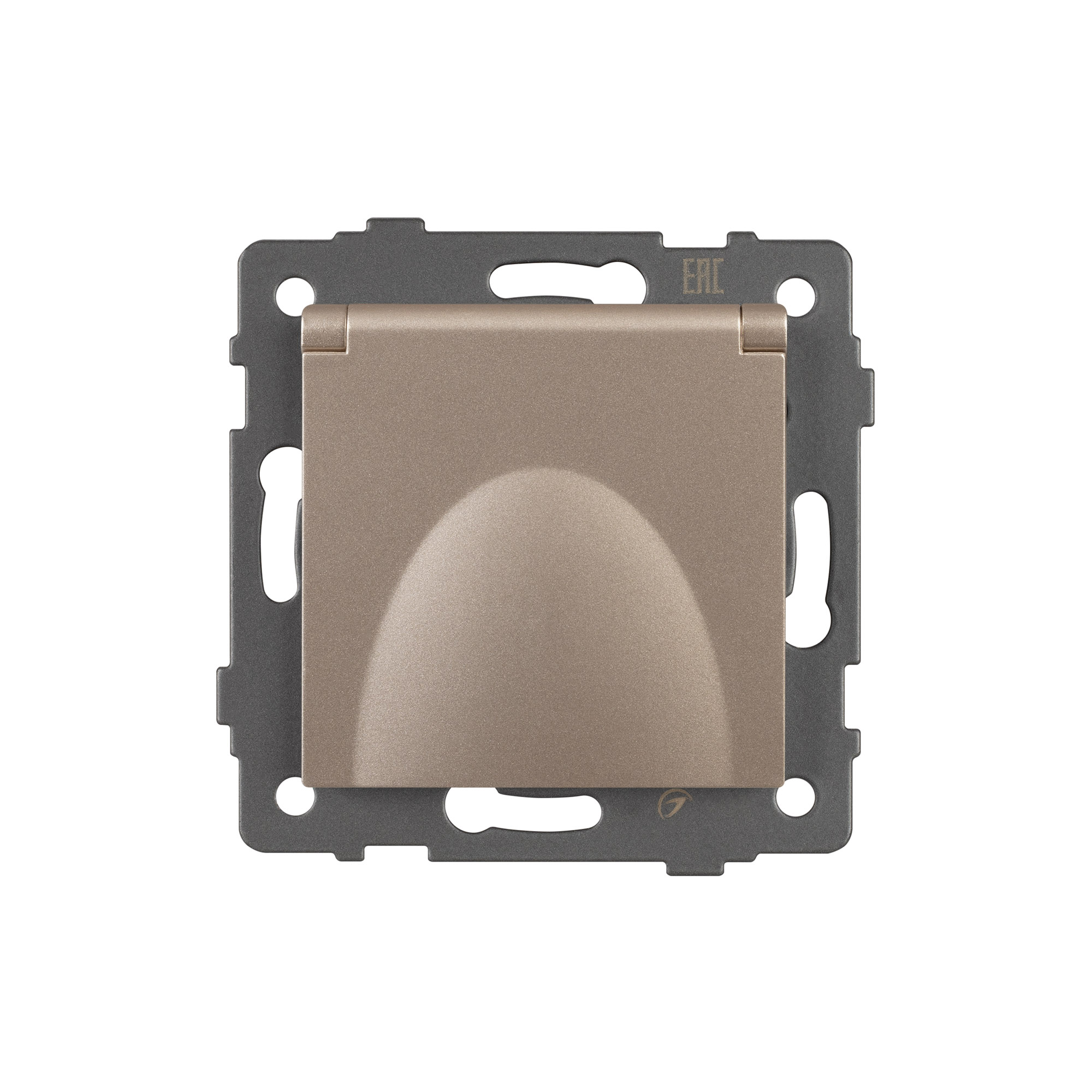 Механизм розетки с заземлением на 1 пост с влагозащитной крышкой. Цвет - золотой. Без фронтальной рамки. Уровень пылевлагозащиты IP44. Устанавливается в стандартный подрозетник.