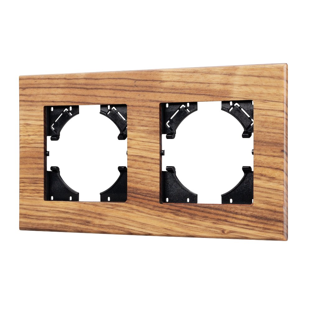 Рамка пластиковая на 2 поста, под встраиваемый механизм, с накладкой из натурального дерева. Цвет накладки - натуральное дерево (осветленный), цвета рамки - черный. Среднего уровня герметичности IP20. Ориентация монтажа  - горизонтальная (основным ориентиром служат посадочные выступы для накладки механизма).