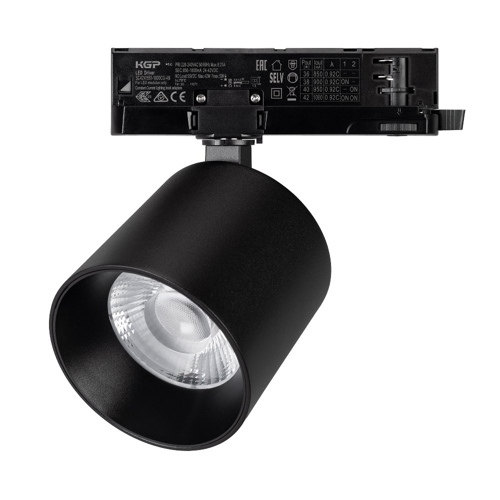 Светильник для трехфазных треков, 36 Вт. Цвет свечения ДНЕВНОЙ 4000K, световой поток 3060 лм, угол 50°, CRI>90. Корпус круглый, металл, цвет черный, IP20. Размеры Ø100x99 мм. Входное напряжение AC220-240V, мощность 36 Вт. Драйвер встроенный (24-42V, 850 mA).Пульсация <1%.