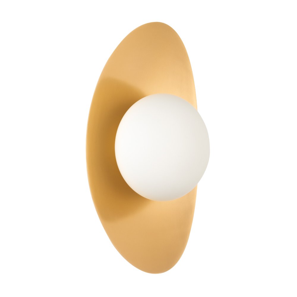 Декоративный настенный светильник. Мощность 6 Вт, св. поток 325-340 лм, 50-52 лм/Вт, теплый 2700 K,теплый 3200К, дневной 4000 K (переключаются), CRI>92, угол 150°, напряжение питания 230 В. Фигурный корпус из  алюминия, гальванизированного в цвет светлое золото, экран из матового стекла, степень защиты IP20. Размер: габариты световой части: Ø145x70 мм, габариты чаши: Ø110 x 42 мм. Монтаж накладной. Встроенный блок питания: 12В DC, 0,75А, пульсация <2%. Встроенный диммер TOUCH-DIM.