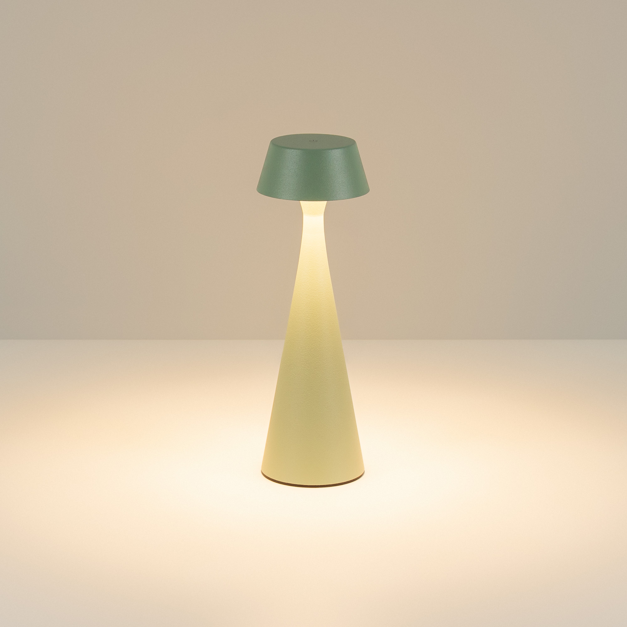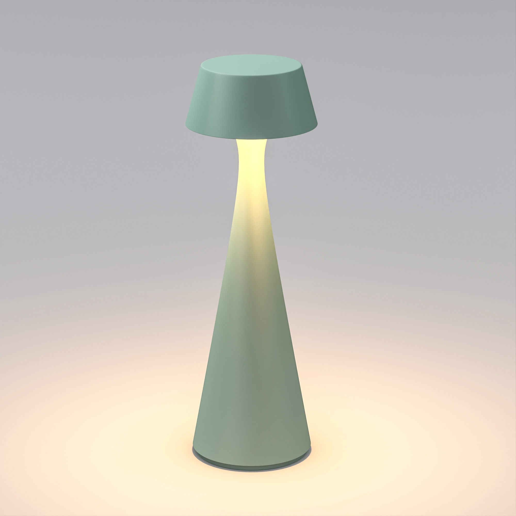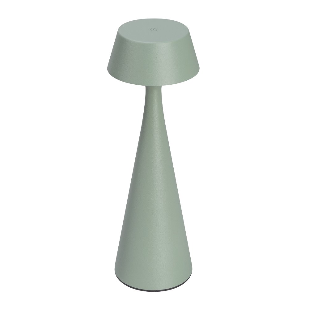 Настольный светильник со встроенным аккумулятором, 2Вт, алюминиевый корпус, цвет зеленый. Цвет ТЕПЛЫЙ БЕЛЫЙ 2200-3000K, св.поток 110-130 лм, CRI(Ra)>80, угол 154°. Размер Ф75x240мм. IP54. Зарядка от сети переменного тока AC220-240V. Тип встроенного аккумулятора 2x2200мАч Li-ion, напряжение батареи 5V