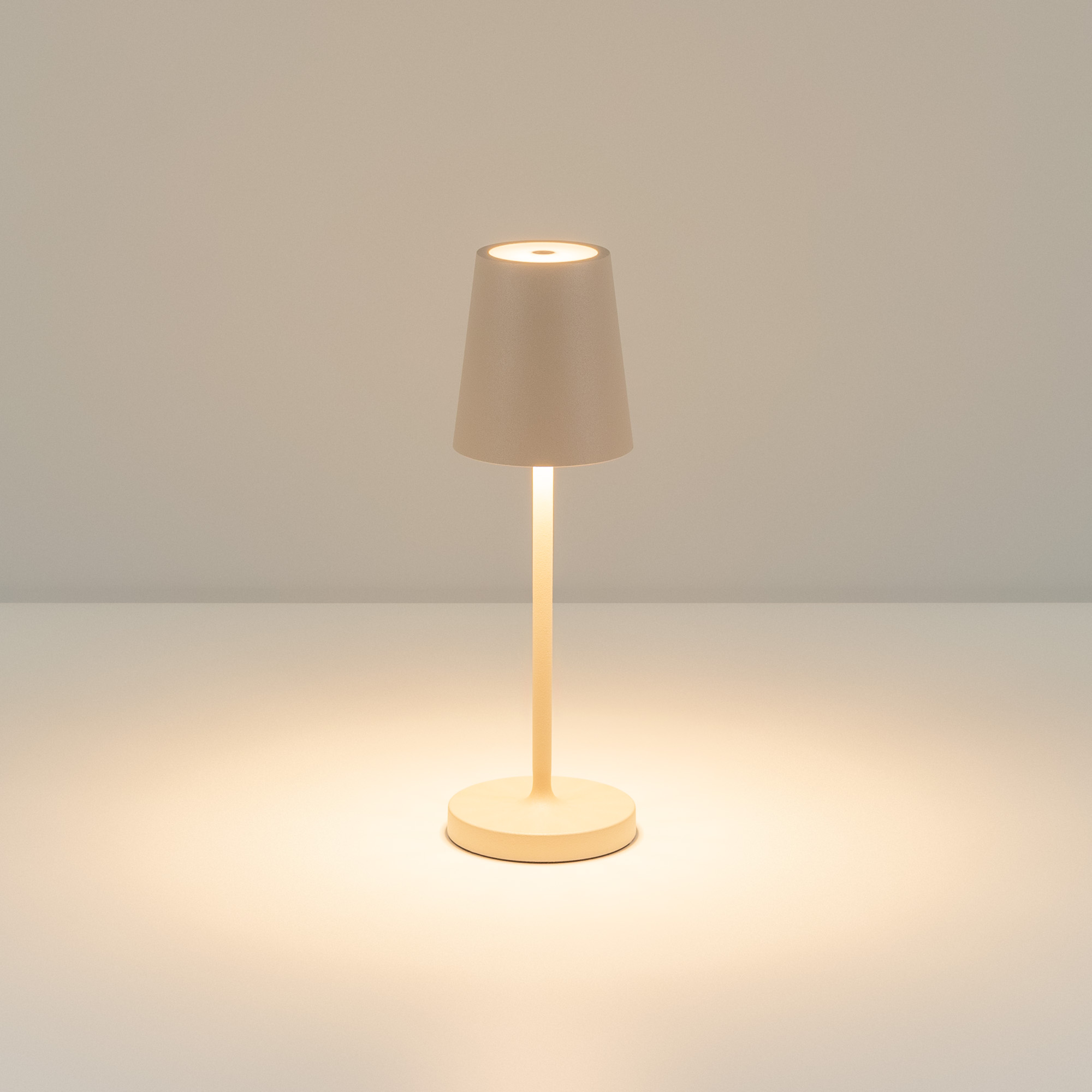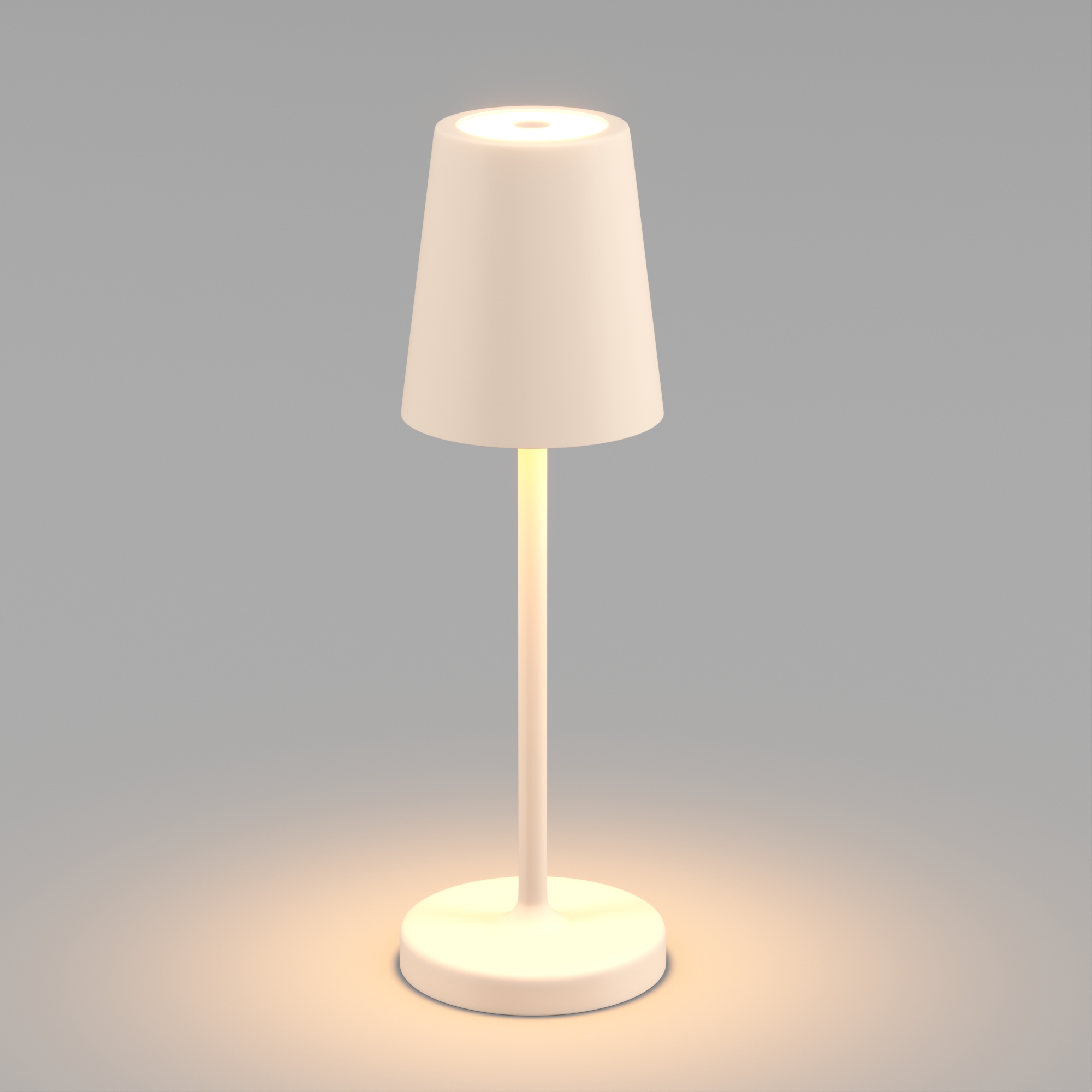 Настольный светильник со встроенным аккумулятором 1.5Вт, алюминиевый корпус, цвет песочный. Цвет ТЕПЛЫЙ БЕЛЫЙ 2200-3000K, св.поток 110-130 лм, CRI(Ra)>80, угол 90°. Размер Ф80x250мм. IP54. Зарядка от сети переменного тока AC220-240V. Тип встроенного аккумулятора 1500мАч Li-ion, напряжение батареи 3.7V