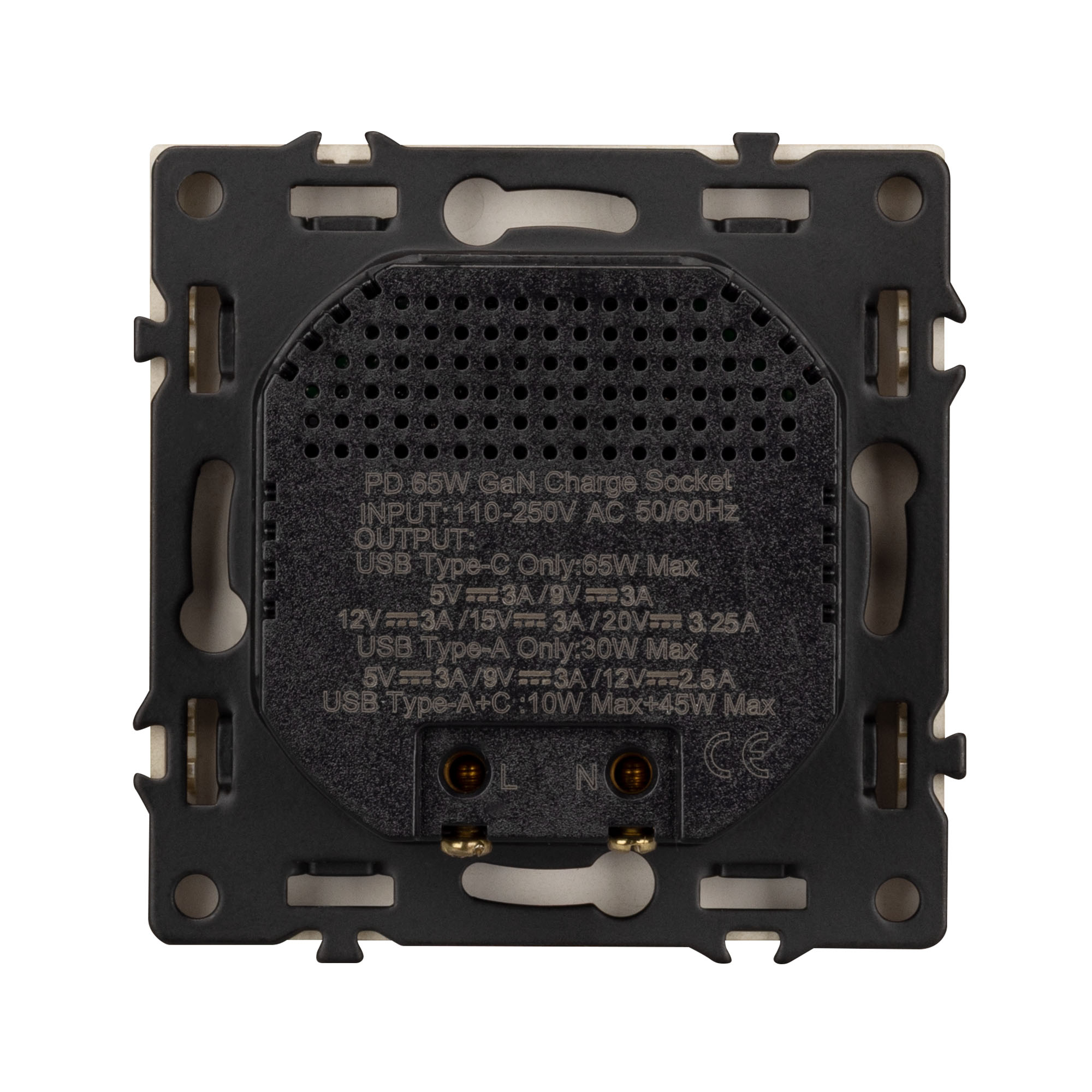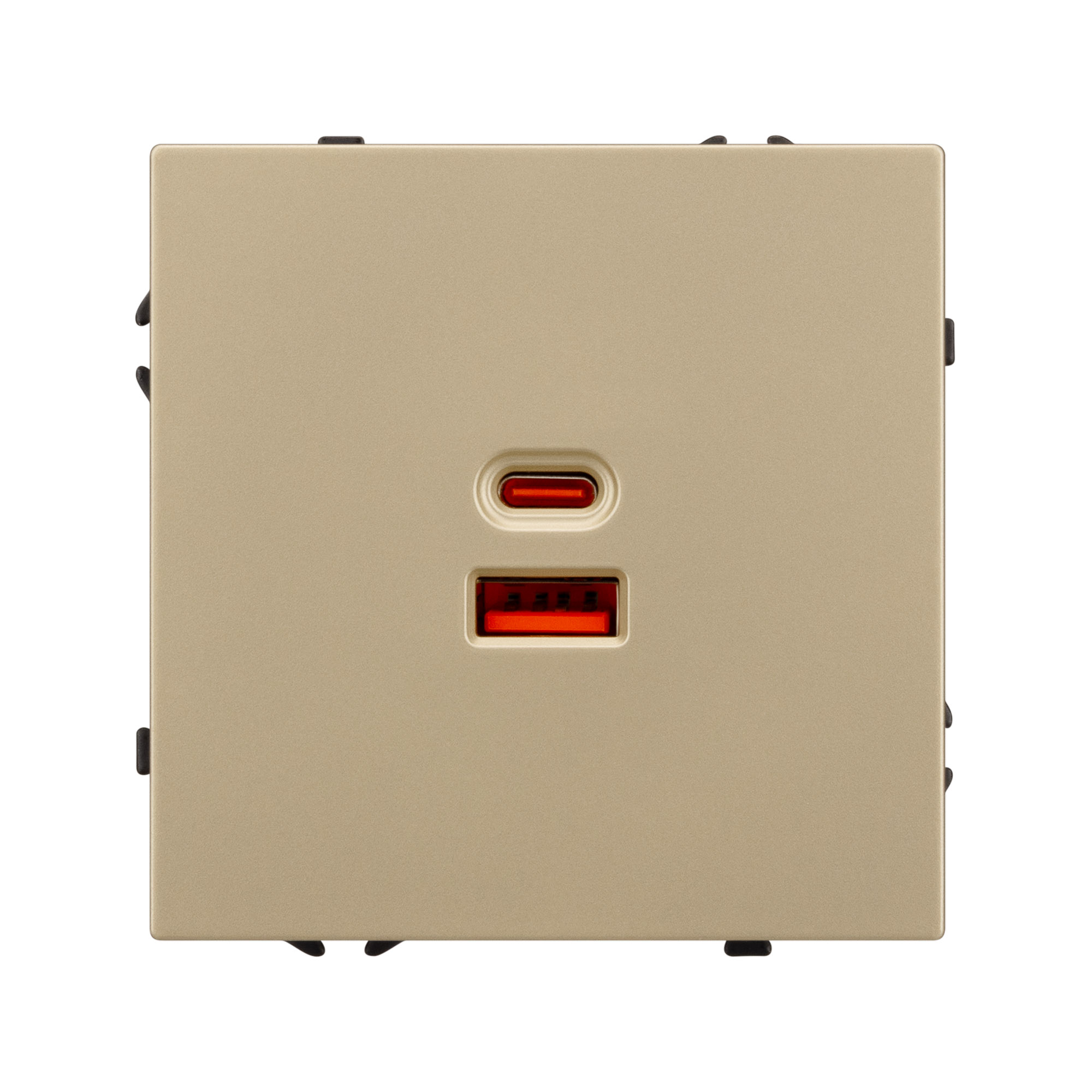 Механизм розетки с быстрой USB зарядкой на 2 порта. Цвет - золотой, с Soft-Touch покрытием. Без фронтальной рамки. Уровень пылевлагозащиты IP20. Тип подключаемого разъема - USB Type A + Type C. Устанавливается в стандартный подрозетник круглого сечения диаметром 60мм.