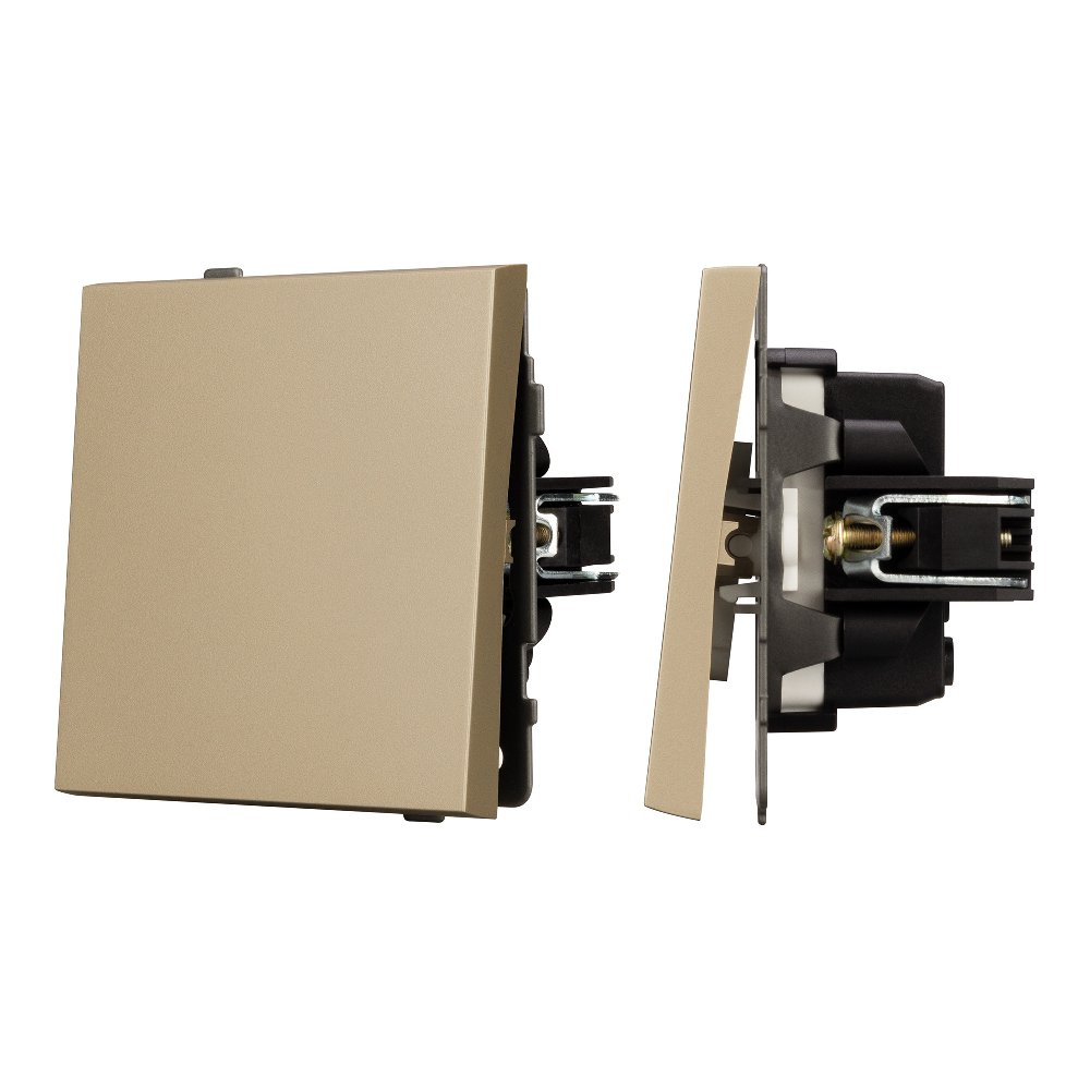 Механизм выключателя света клавишный на 1 пост 1 клавиша (проходной). Цвет - золотой, с Soft-Touch покрытием. Без фронтальной рамки. Уровень пылевлагозащиты IP20. Выключатель устанавливается в стандартный подрозетник круглого сечения диаметром 60мм.