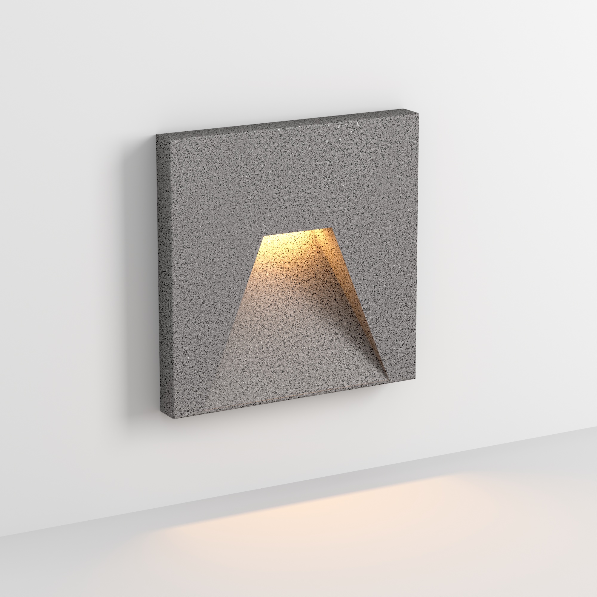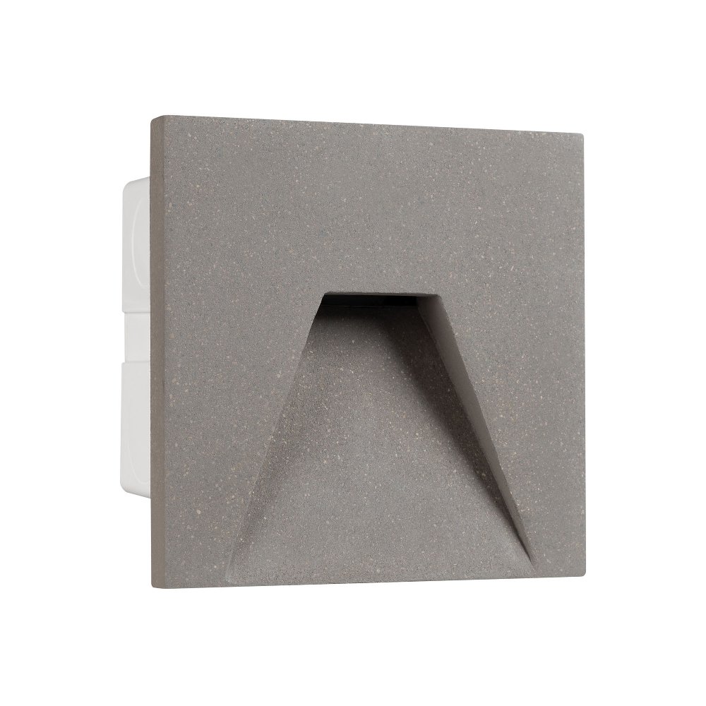 Светодиодный встраиваемый квадратный светильник для стен, лестниц. Мощность 3Вт, световой поток 80 лм, теплый 3000К, угол 75x30°, CRI>80, напряжение 230 В. Квадратный корпус из бетона серого цвета и алюминия. Степень защиты IP65. Питание AC230V, мощность 3Вт. Размеры LхWхH 100х100x76 мм. Драйвер встроенный, пульсация <0.5%.