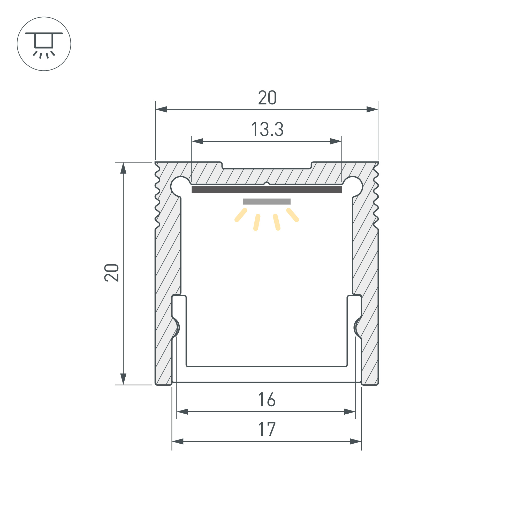 Алюминиевый анодированный профиль для светодиодных лент и линеек. Габаритные размеры (L×W×H): 3000x20x20 мм. Ширина площадки для ленты 13,3 мм. Экраны, заглушки и другие аксессуары приобретаются отдельно. Цена за 1 метр.